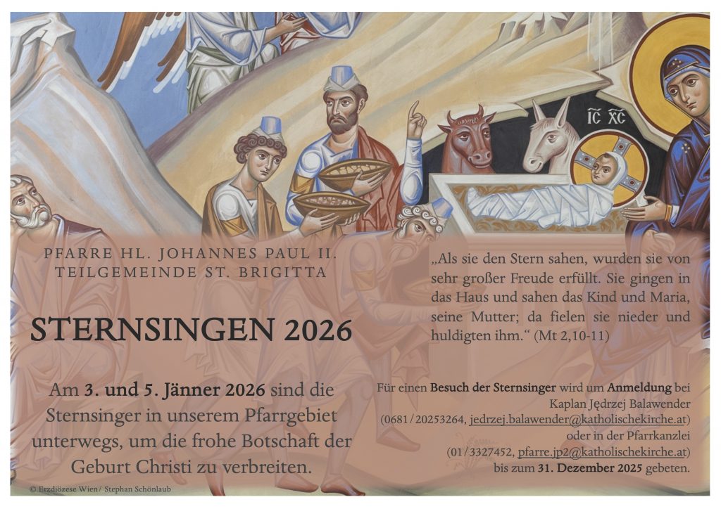Am 3. und 5. Jänner 2026 sind die Sternsinger in unserem Pfarrgebiet unterwegs, um die frohe Botschaft der Geburt Christi zu verbreiten.