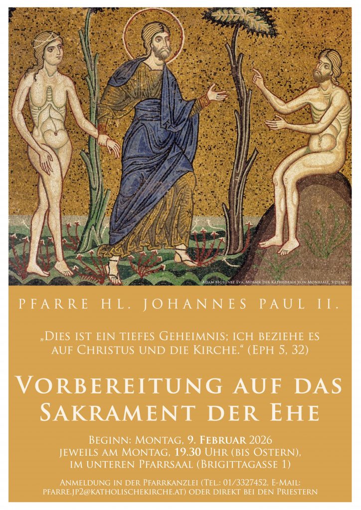 In unserer Pfarre versuchen wir seit einigen Jahren, den Paaren eine angemessene Vorbereitung auf ihrem Weg zur Eheschließung anzubieten. Ein Team, das aus zwei Ehepaaren und einem Priester besteht, übernimmt diesen Dienst anhand ihrer eigenen Erfahrungen und der Lehre der Kirche, insbesondere der Theologie des Leibes des Hl. Johannes Paul II. Die Abende finden am Montag, um 19:30 Uhr, im unteren Pfarrsaal, wöchentlich statt (bis Ostern, Dauer: ca. 1. Stunde).